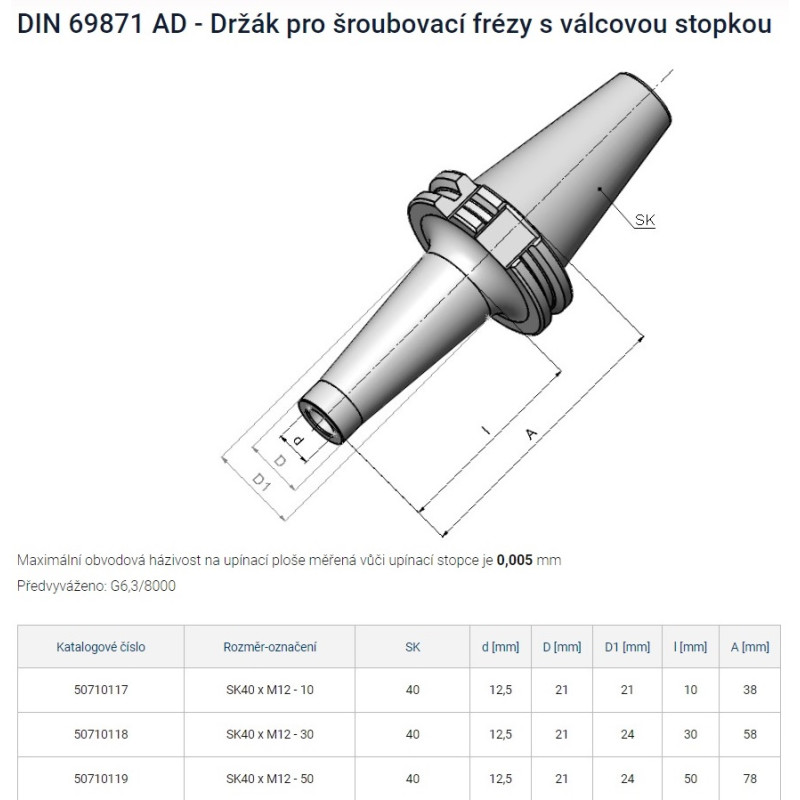 Držák SK40 pro šroubovací frézy M12, délka 50/78 mm, PILANA
