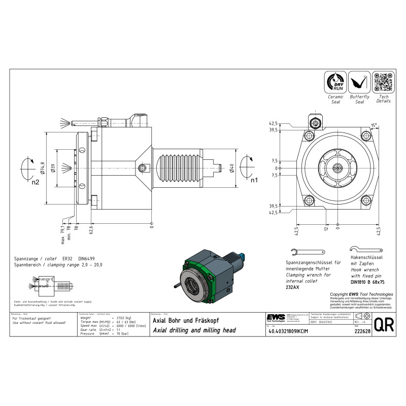 Axiální poháněná hlava VDI40/ER32, DIN 1809, s vnitřním chl. HPC-Line, EWS