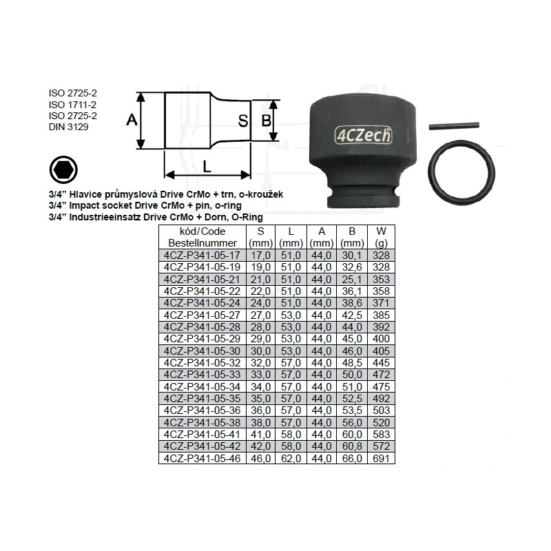 3/4” Hlavice průmyslová - 17 mm šestihranná CrMo + trn, o-kroužek