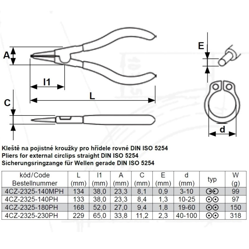 Kleště na pojistné kroužky pro hřídele rovné 140 mm, hrot 1,3 mm