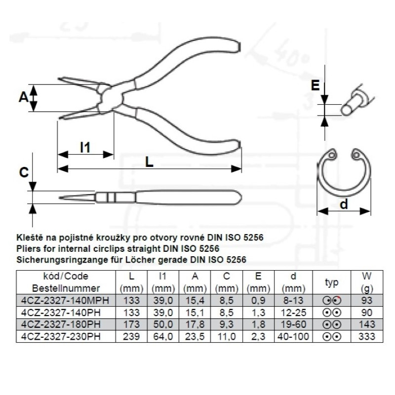 Kleště na pojistné kroužky pro otvory rovné 140 mm, hrot 1,3 mm