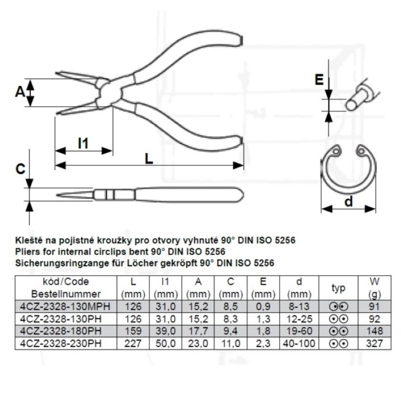 Kleště na pojistné kroužky pro otvory vyhnuté 90° 130 mm, hrot 1,3 mm