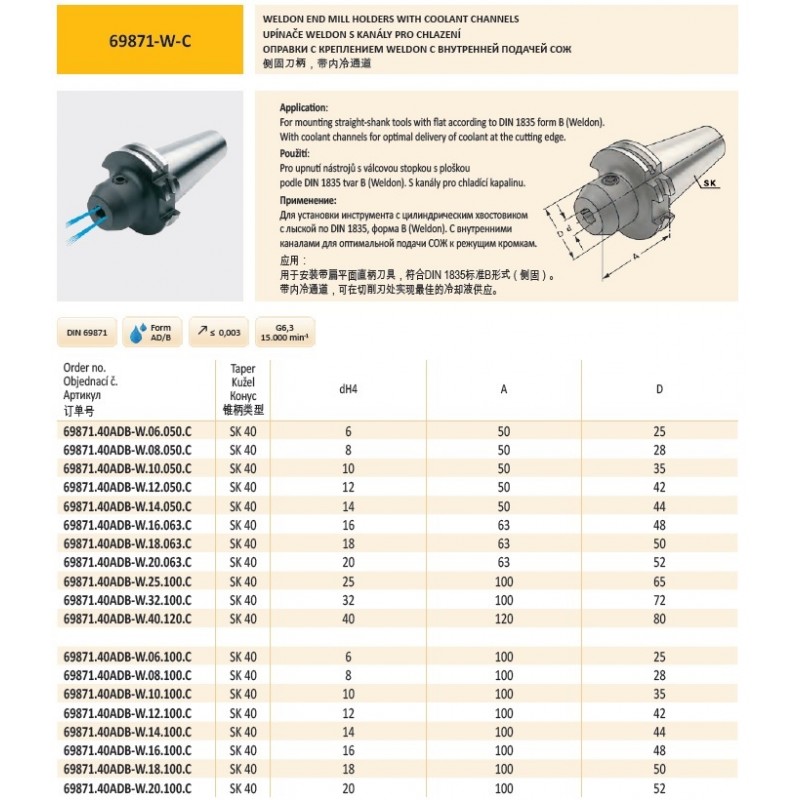 - d = 16 až 40 se čtyřmi kanály pro řeznou kapalinu