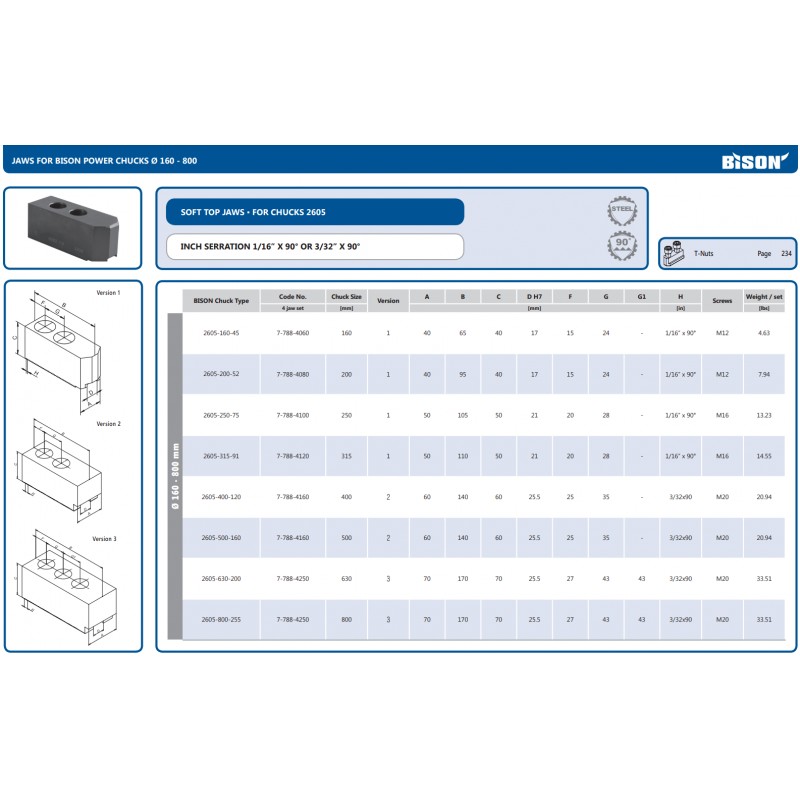 Tvrdé stupňovité čelisti (4ks), 1/16” x 90°, pro sklíčidla BISON 200 mm