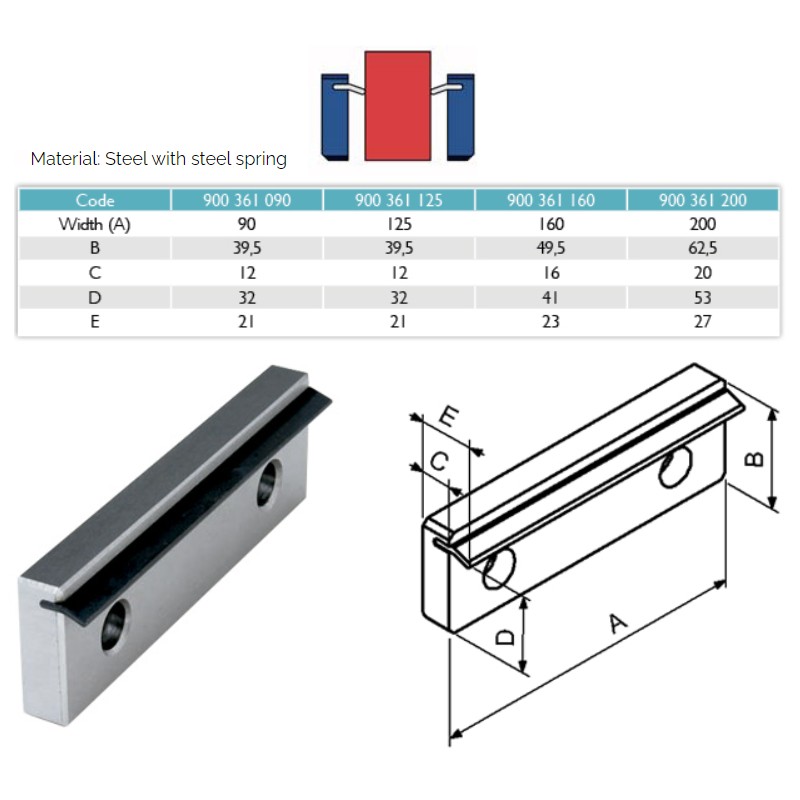- Standardní stahovací čelist s pružinovým listem pro strojní svěráky ARNOLD s šířkou 125 mm