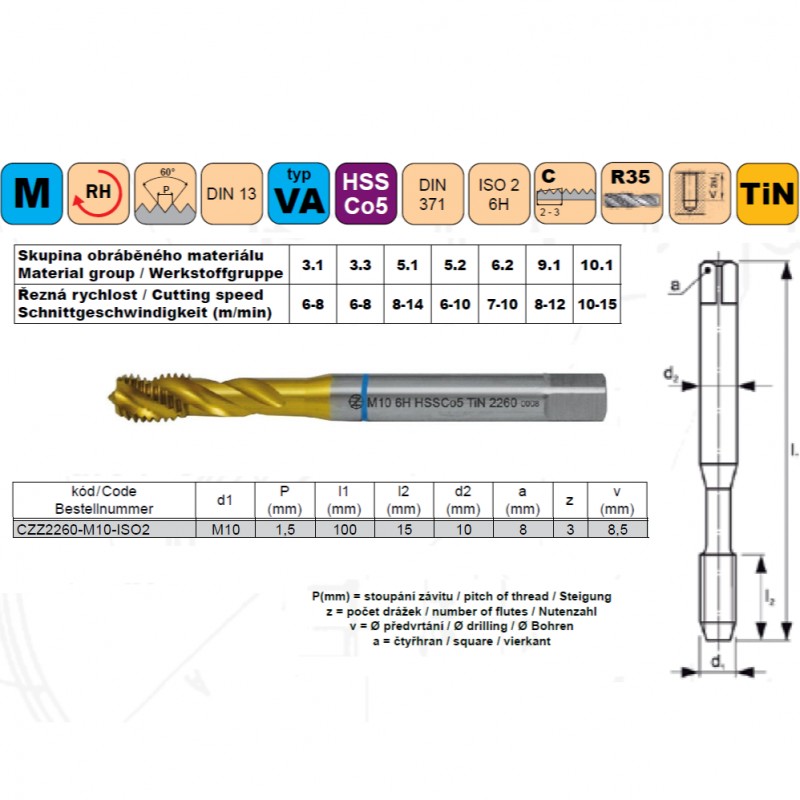 - Strojní závitník pro metrický a jemný metrický závit se šroubovitou drážkou
