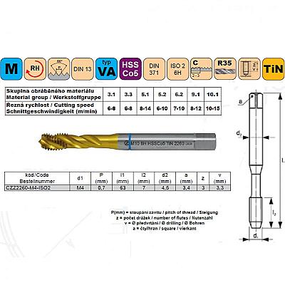- Sada strojního závitníku M4 x 0,7 HSSCo5 + TiN a vrtáku 3,30 mm