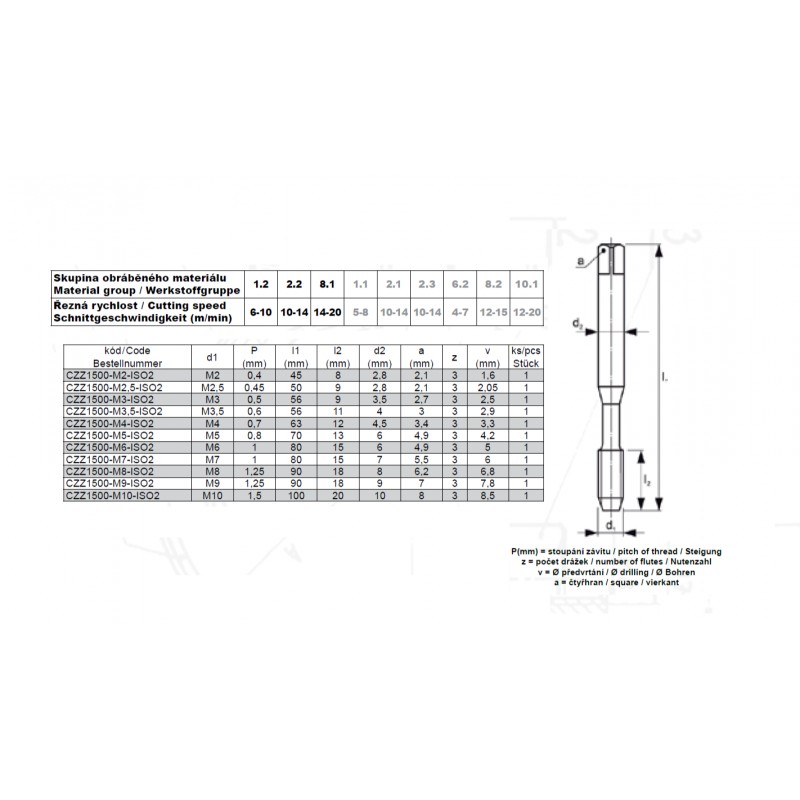 - Strojní závitník pro metrický a jemný metrický závit s přímou drážkou a lamačem třísek